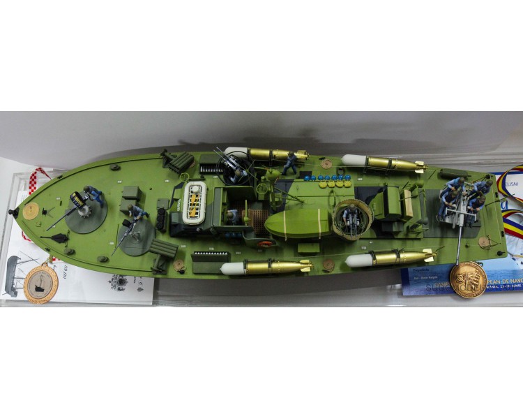 На протяжении Второй Мировой Войны Военно-морской флот США применял обширный парк торпедных катеров, состоящий из кораблей трех типов: 78-футовый "Higgins" а так же 77- и 80-футовые катера ELCO. Каждый тип можно отделить от других по длинне, конфигурации, вооружению и другим признакам. 80-футовые ELCO являлись наиболее распространенным типом: было выпущено 5 серий общей численностью порядка трехсот экземпляров. Выполненый из красного дерева корпус и три 1,350-сильных двигателя "Паккард" 4M-2500 (форсированных до 1500 сил в последних сериях) позволяли катеру разгоняться до 40 узлов. Оборудование и вооружение постоянно изменялось и улучшалось на основании опыта боевого применения и изменения тактических ролей катера согласно боевой ситуации: в процессе войны торпедные катера США, по сути, утратили основную роль атаки морских транспортных путей противника, приняв на себя роль судов огневой поддержки, применяемых у береговых линий и в каналах. Модель производства "Italeri" воспроизводит катер PT 596 последней серии выпуска.